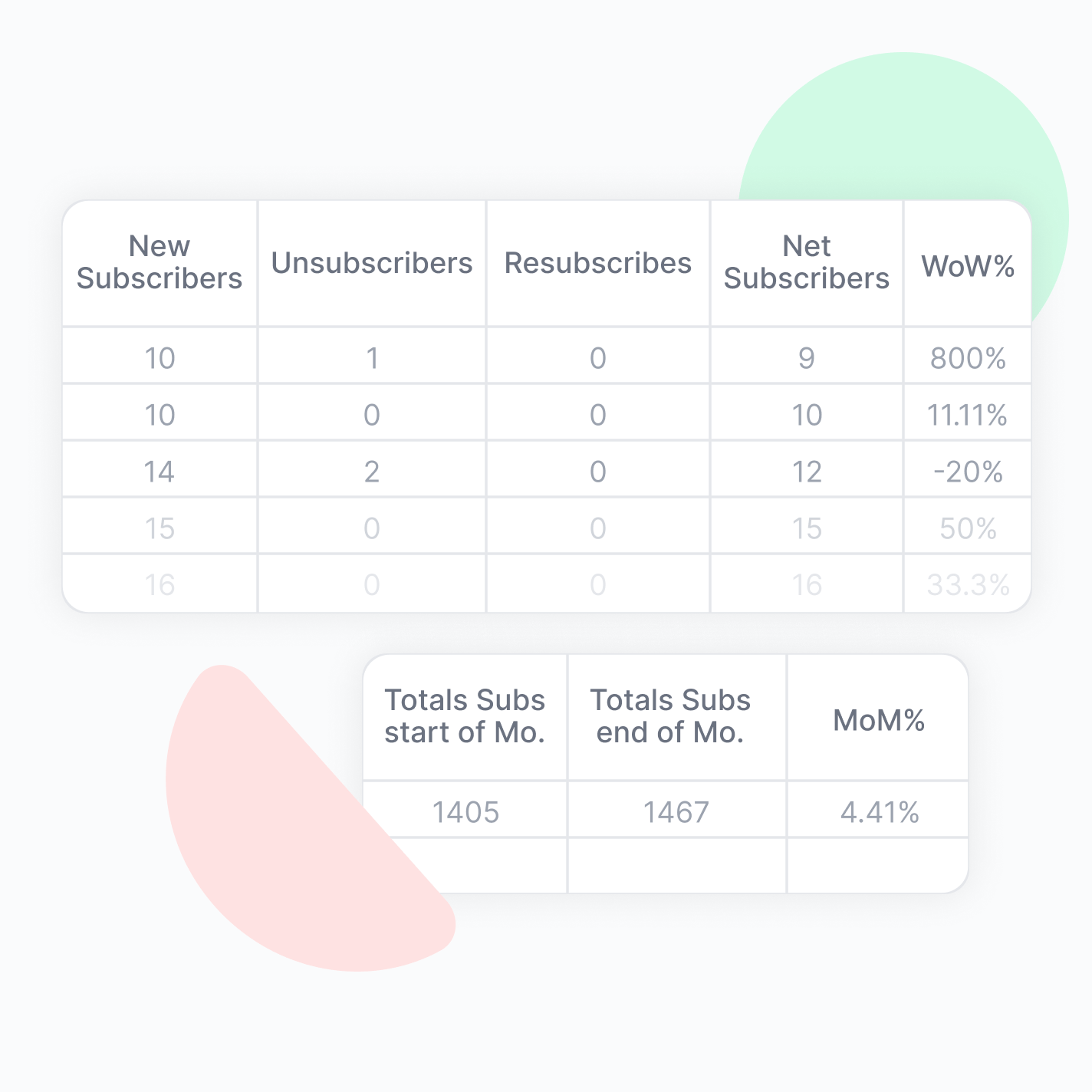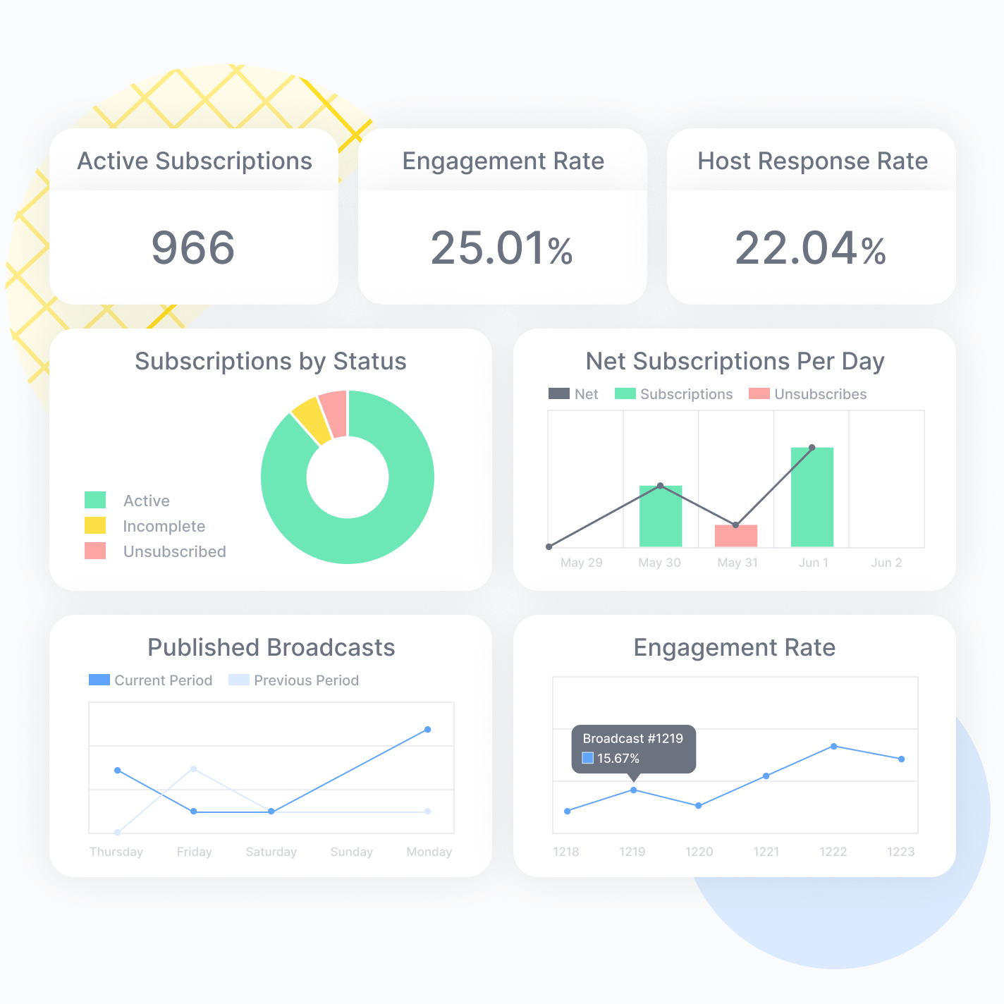 Stay informed in real time. Track live performance indicators — including total subscribers, churn rate, and response rate — to keep a pulse on your channel’s health at every moment.