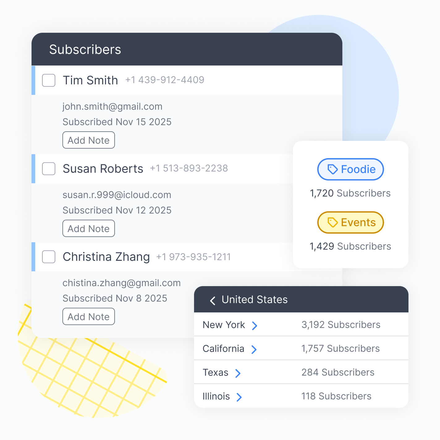 Track your audience’s health with clear subscriber-level reporting. Monitor new subscribers, unsubscribes, and re-subscribers by date or week. View full profiles — including geo-location, email, and tag data — and see exactly where each subscriber signed up to identify your strongest acquisition channels.