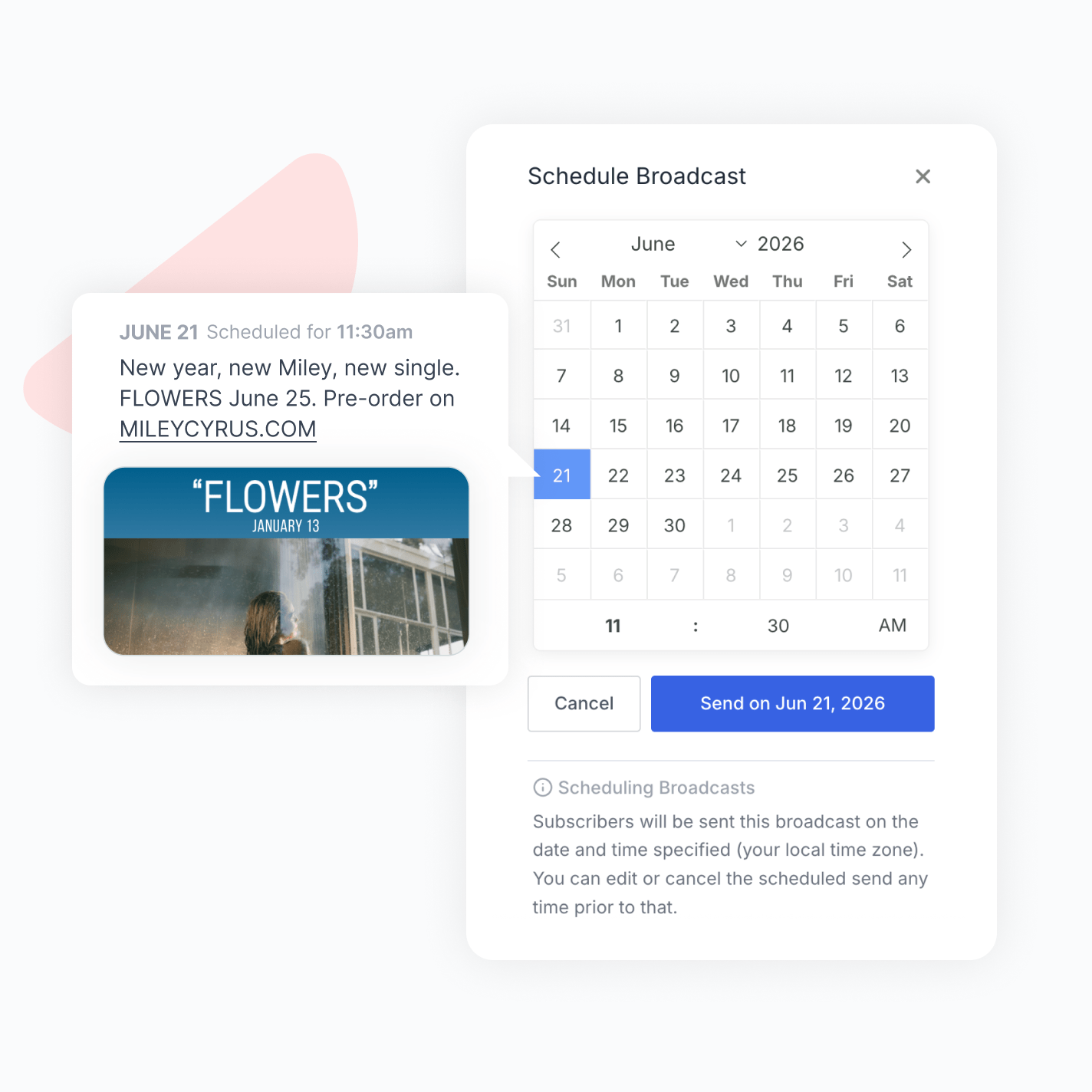 Take a breather on your busiest days by scheduling your texts in advance. Whether it’s a big launch or a new episode, your subscribers will know the moment it drops.