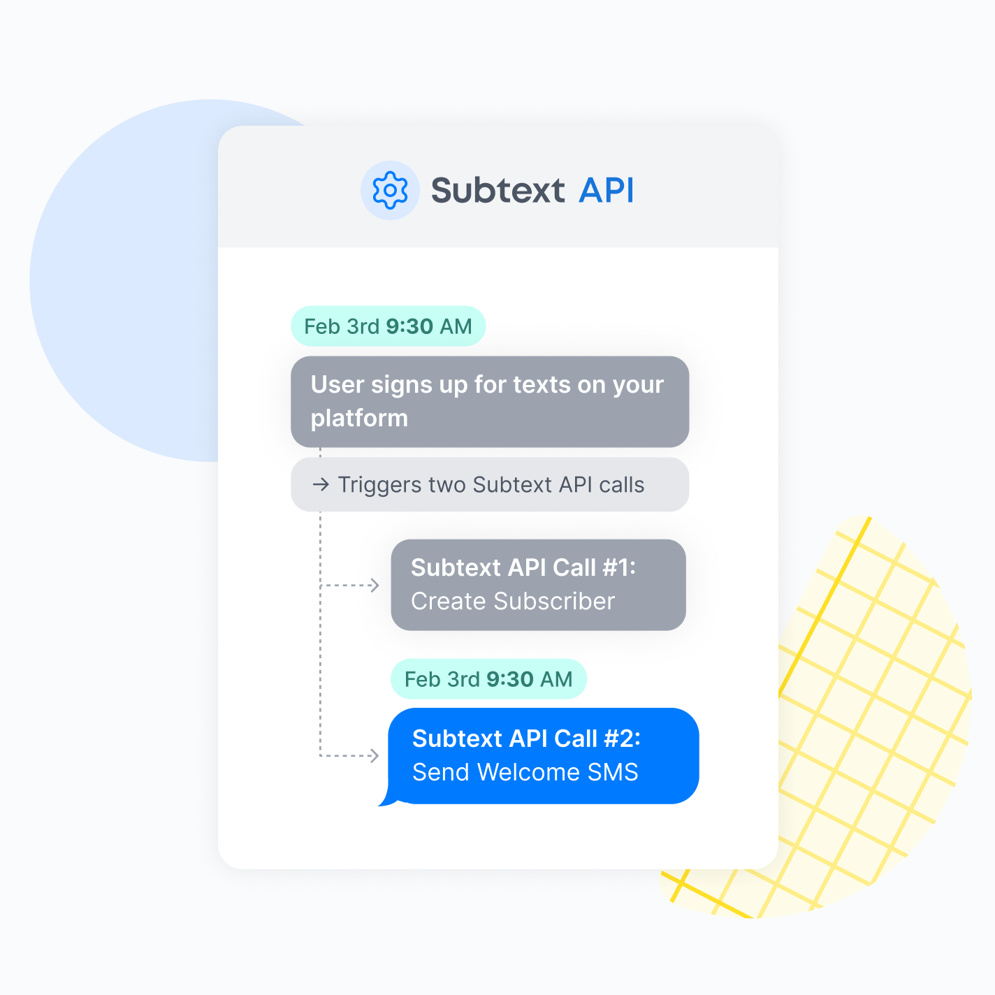 Unlock deeper customization. Subtext’s SMS API lets you integrate automated messaging, triggers, and subscriber interactions directly into your existing systems—giving your team the power to build custom SMS workflows that scale with your operation.